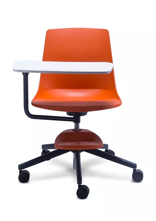 Pupitre giratorio con elevación neumática, asiento y respaldo en una sola pieza de polipropileno y fibra de vidrio con diseño ergonómico, base de 5 puntas de aluminio pintado, tableta de escritura giratoria 180°, accesorio porta Ipad.